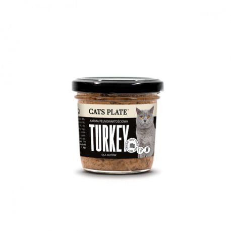Cats Plate Turkey - słoiczek pełen zdrowia i miłości do kotów. To pełnowartościowa karma odpowiednia dla kotów w każdym wieku, każdej rasy i wielkości. Skład karmy optymalnie zaspokaja wszystkie potrzeby żywieniowe  kotów domowych, zapewniając energię i witalność, zdrową i lśniącą sierść oraz bardzo dobre trawienie. To karma o wyjątkowej smakowitości, przekona koty niejadki.      Karma zawiera mięso z podudzi indyka (80%) z dodatkiem wartościowej wątróbki, serc i żołądków indyka (14%). Do produkcji używane jest mięso i podroby najwyższej jakości,  spełniające najwyższe standardy jakości i pochodzące od lokalnych dostawców