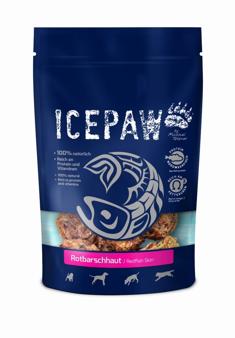 ICEPAW Rotbarschhaut - przysmaki z karmazyna dla psów 100% suszonych skór karmazyna. W 100% naturalne, bogate w witaminy i minerały oraz kwasy Omega-3.